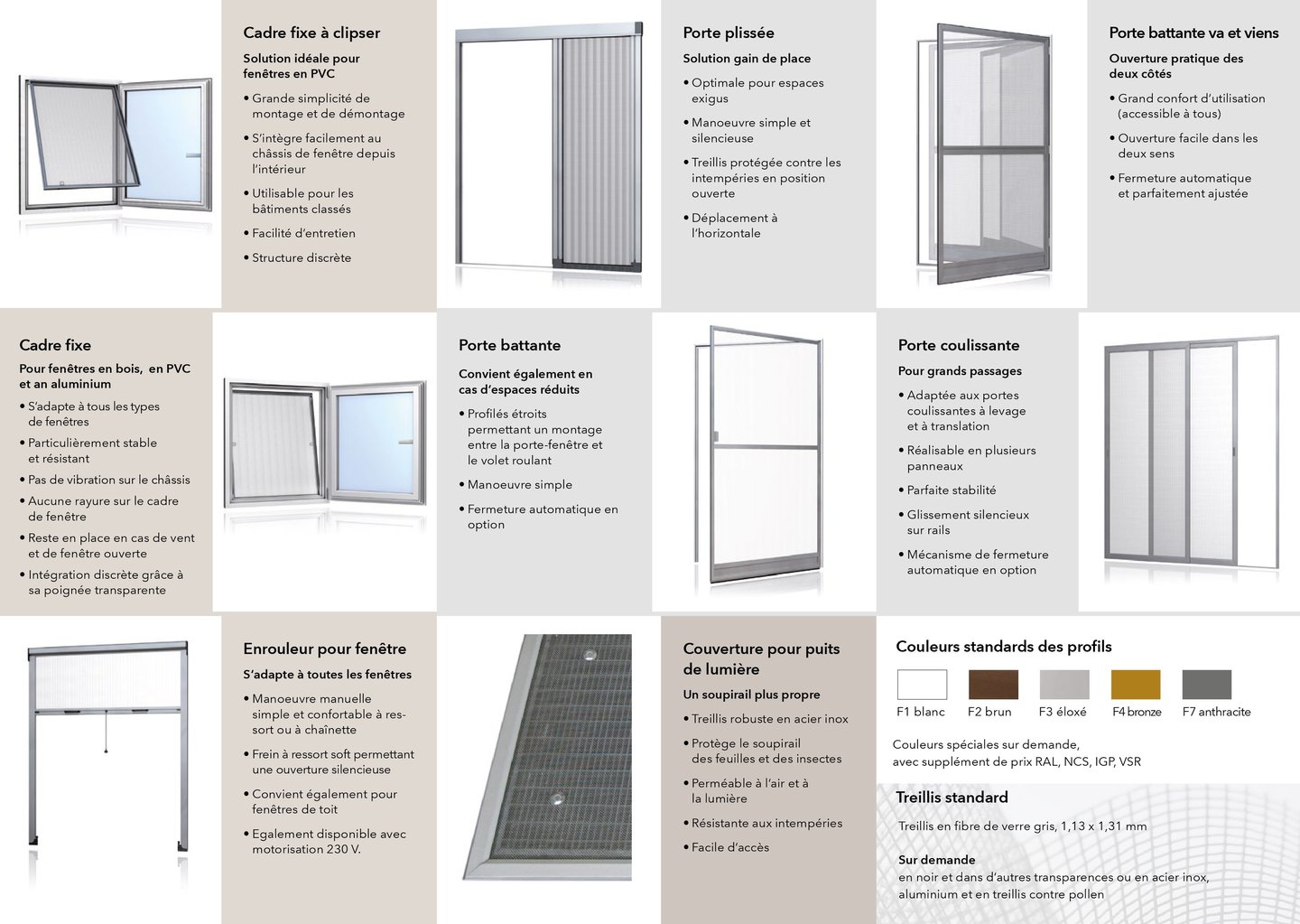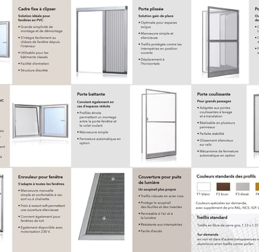 Une technique sophistiquée et un surcroît de qualité et de confort caractérisent toutes les moustiquaires MHZ. Les cadres moustiquaires amovibles sur mesure, les portes battantes et va-et-vient ainsi que les panneaux coulissants, les portes plissées et les enrouleurs peuvent être posés en quelques étapes.