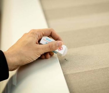 La toile acrylique est imprégnée. Nettoyez la toile si nécessaire comme suit: Les petites tâches peuvent être éliminées avec une gomme incolore ou en les brossant à sec. Lors d’une légère salissure la toile peut être nettoyée avec une eau savonneuse diluée (5%, température environ 30 °C) au moyen d’une brosse douce. Bien rincer avec de l’eau claire. Si nécessaire, répéter cette procédure. La toile doit être entièrement sèche avant de l’enrouler. Lors de fortes salissures, nous vous recommandons l’utilisation de produits de nettoyage spécialement adaptés à des toiles de stores et ce, selon le mode d’emploi de ce dernier. En aucun cas vous ne devez utiliser un appareil de nettoyage à haute pression. En cas de nécessité et afin de ré-imprégner la toile acrylique, utilisez un sray d’imprégnation adapté (par exemple Fabric GuardTM).