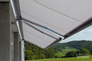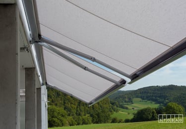 La grande stabilité des bras articulés et télescopiques permet une projection sûre sans dispositifs de protection supplémentaires. La technique à bras télescopique mise au point par STOBAG permet de réaliser également de très grandes superficies d’ombrage allant jusqu’à 90 m2.
